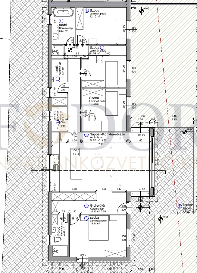 A nappaliból közvetlen kijárat nyílik egy 22 m²-es teraszra, amely ideális családi vagy baráti összejövetelekhez.