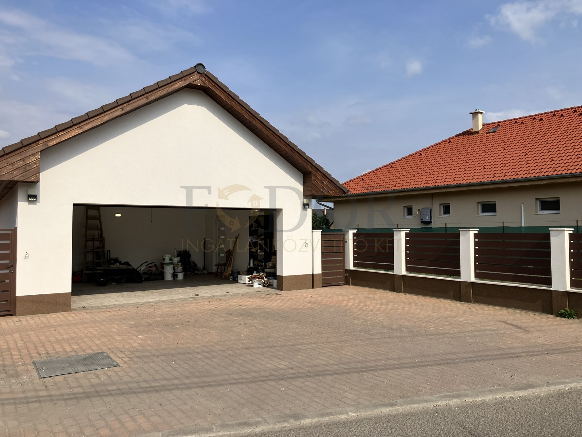 Az ingatlan különlegessége, hogy az utcafronton nem maga a lakótér, hanem egy 37 m²-es, dupla állásos garázs helyezkedik el, motoros, szekcionált garázskapuval. A garázs előtt viacolorral burkolt, több autó parkolására is alkalmas terület található. A kert megközelíthető a garázson keresztül, illetve egy külön kiskapun át is.