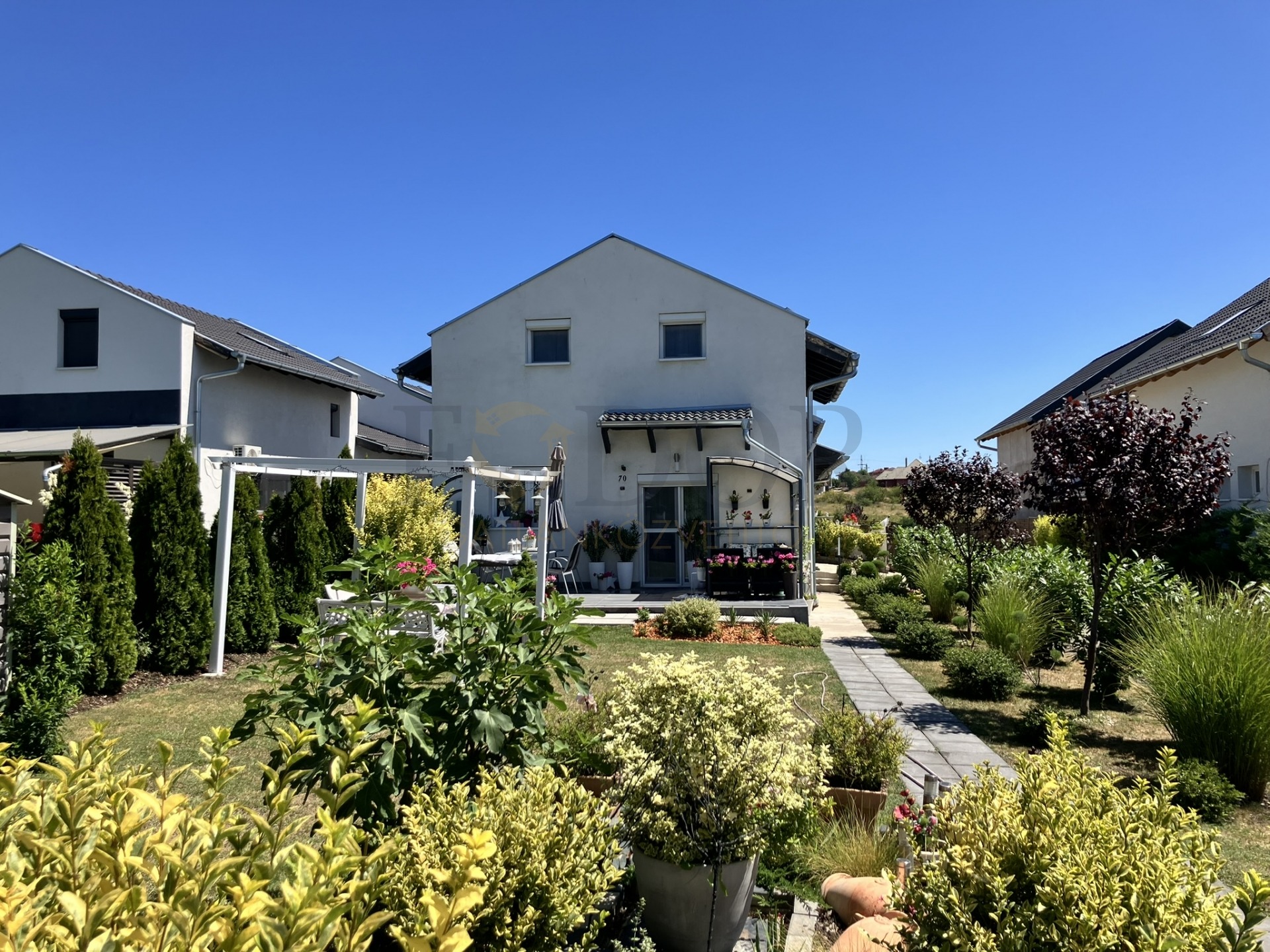• Elektromos nagykapu és közös szorgalmi út vezet a szekcionált, motoros, hőszigetelt garázskapun keresztül a házhoz.