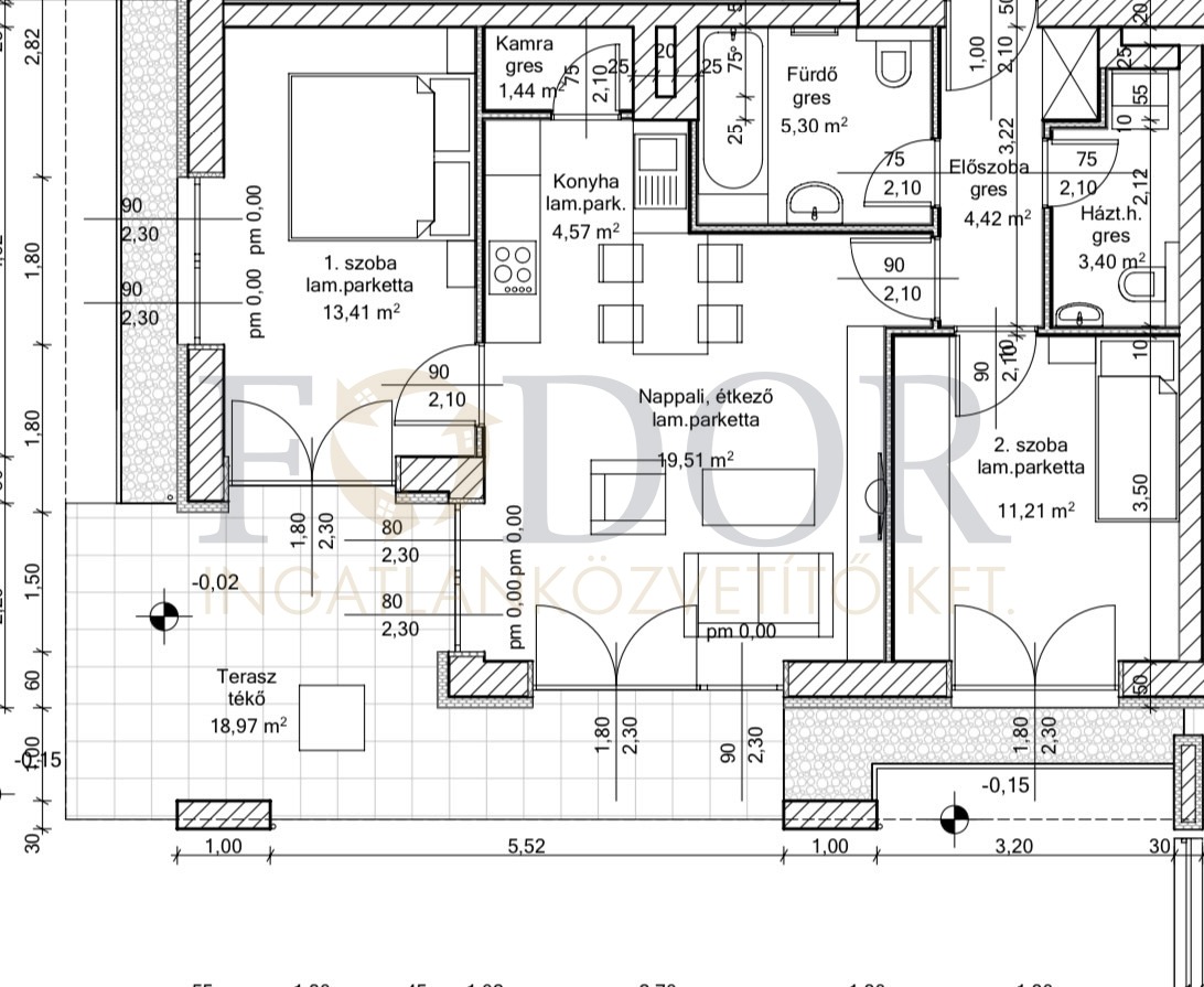 E szemet gyönyörködtető, 63 m²-es földszinti lakás porotherm 38-as téglából készült, és 16 cm-es grafitos szigeteléssel rendelkezik, ami kiváló hőszigetelést biztosít. A lakás kialakítása amerikai konyhás nappali + 2 kényelmes szobával tökéletes lehetőséget kínál a családok számára.