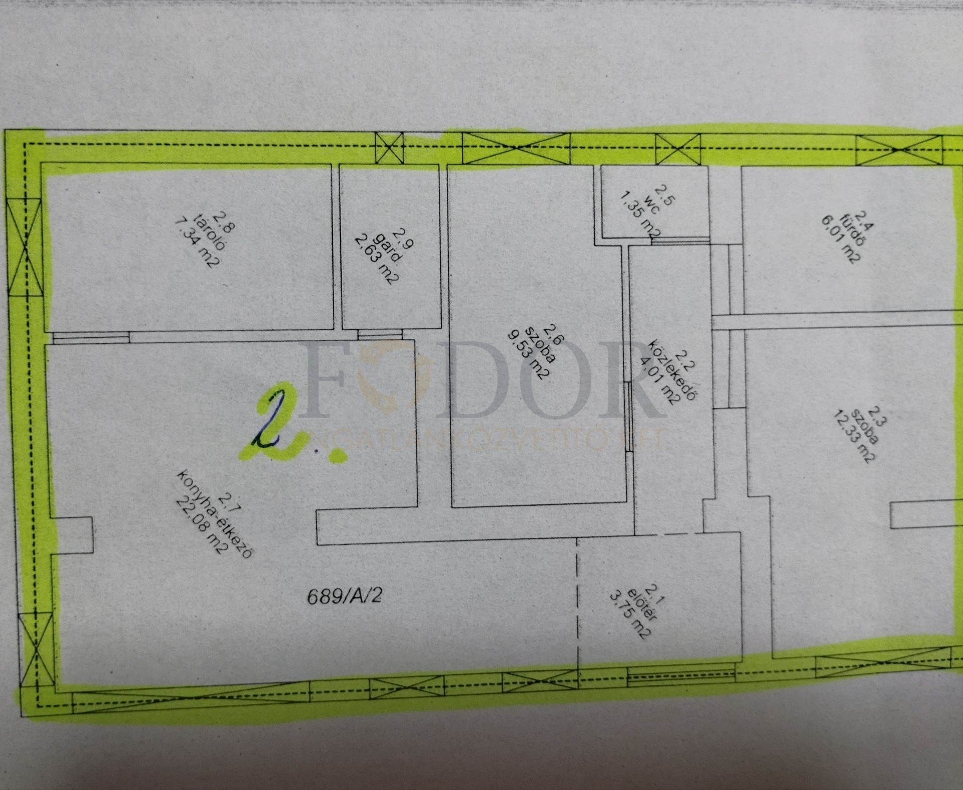 Az ingatlan nyélen keresztül megközelíthető, nettó 69 m² alapterületű, 2 szobás lakás, amelyhez 500 m² saját telekterület tartozik.
